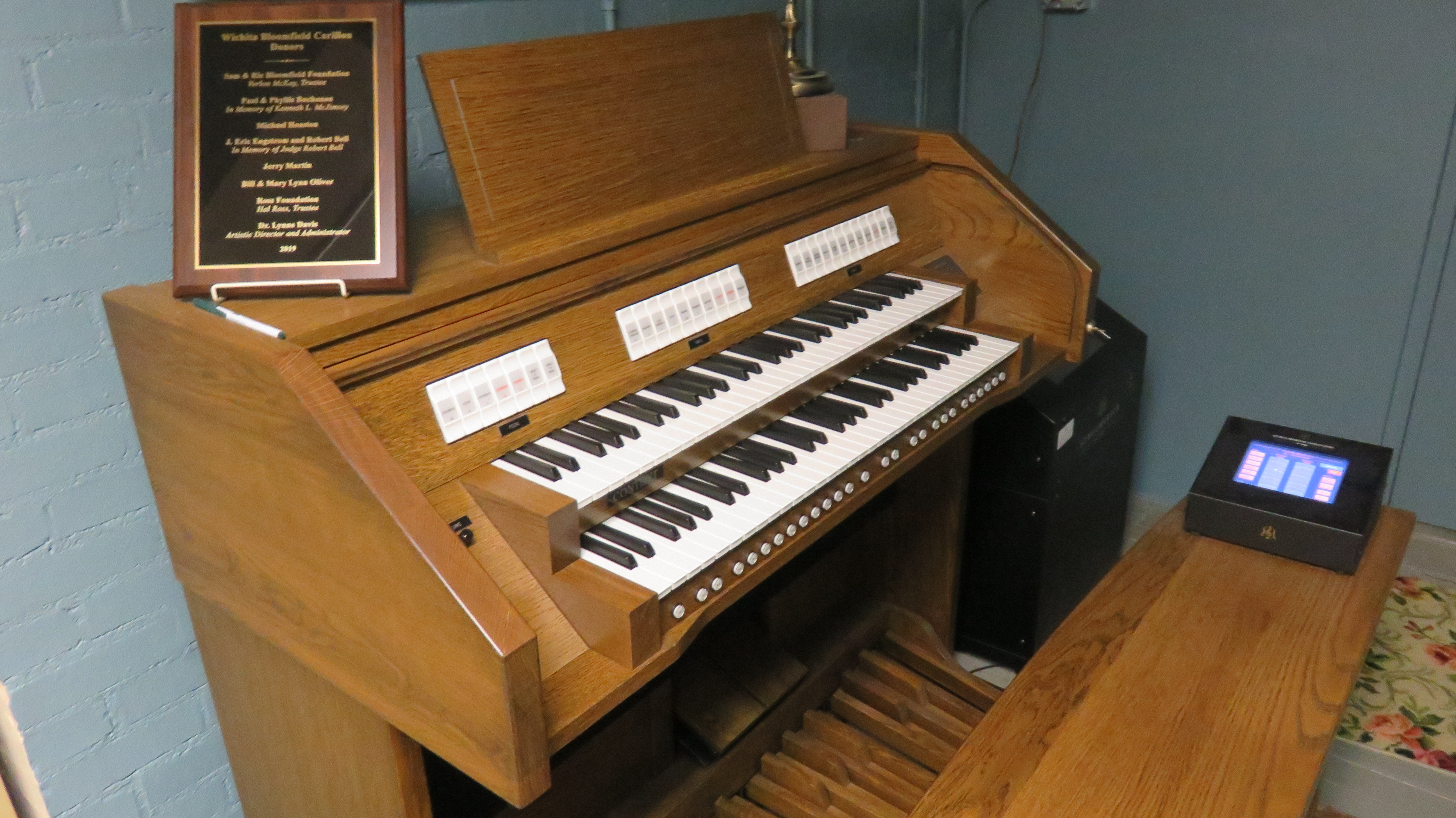 Wichita natives Wayland and Zach acted as my Sherpas. There is a somewhat secret door that leads to a metal staircase that leads into a small room. The tower’s original carillon organ is there, just around the corner from the new one. Interestingly, there are no actual bells in the tower. The carillon’s sound is produced by an organ and speakers. Well… that’s not entirely true, there is one bell at the top, but it is not used anymore as it is a safety hazard.