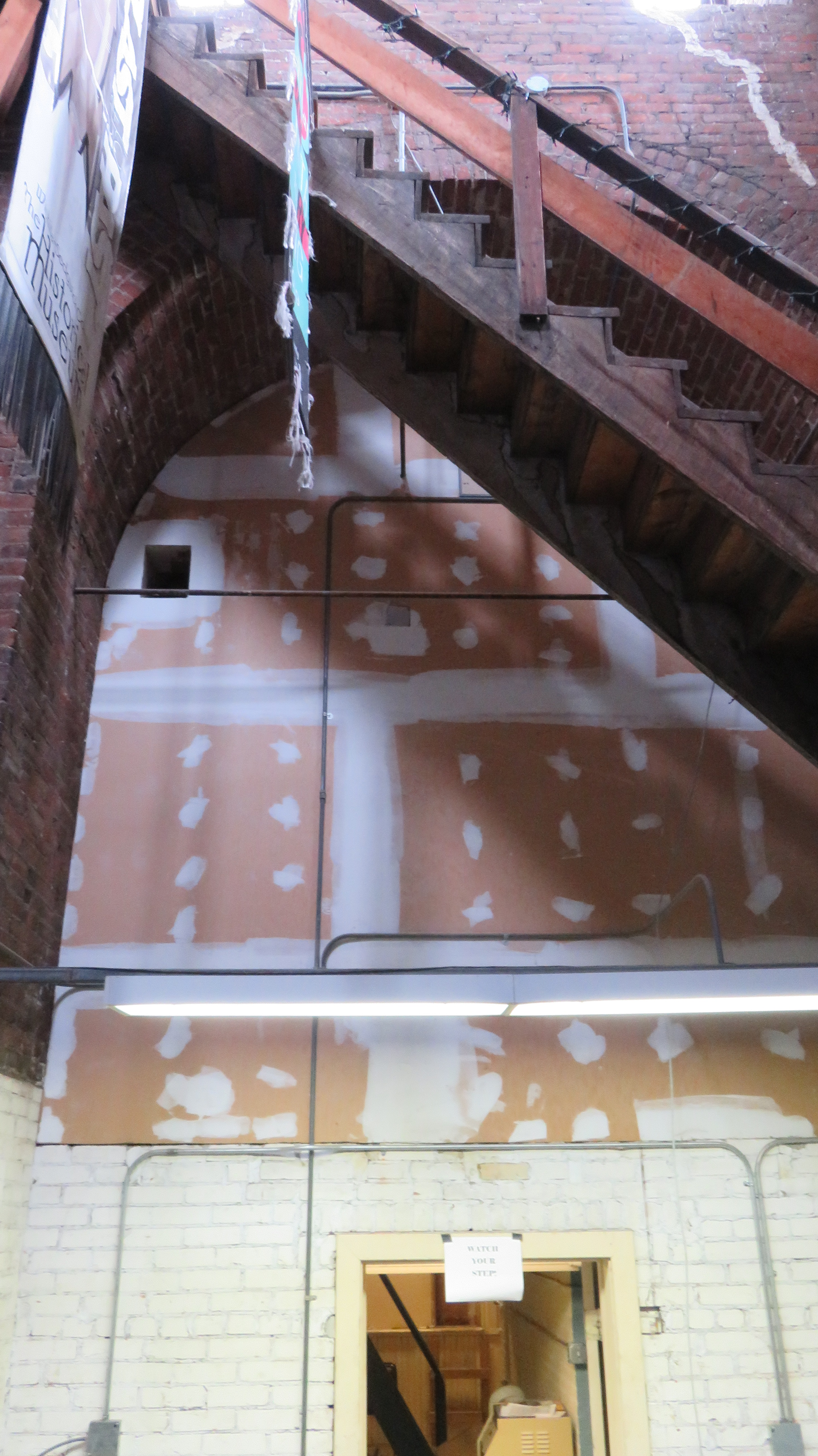 Next we walked into the base of the tower. A small gray colored room with wooden stairs that begin their ascent into the darkness above.